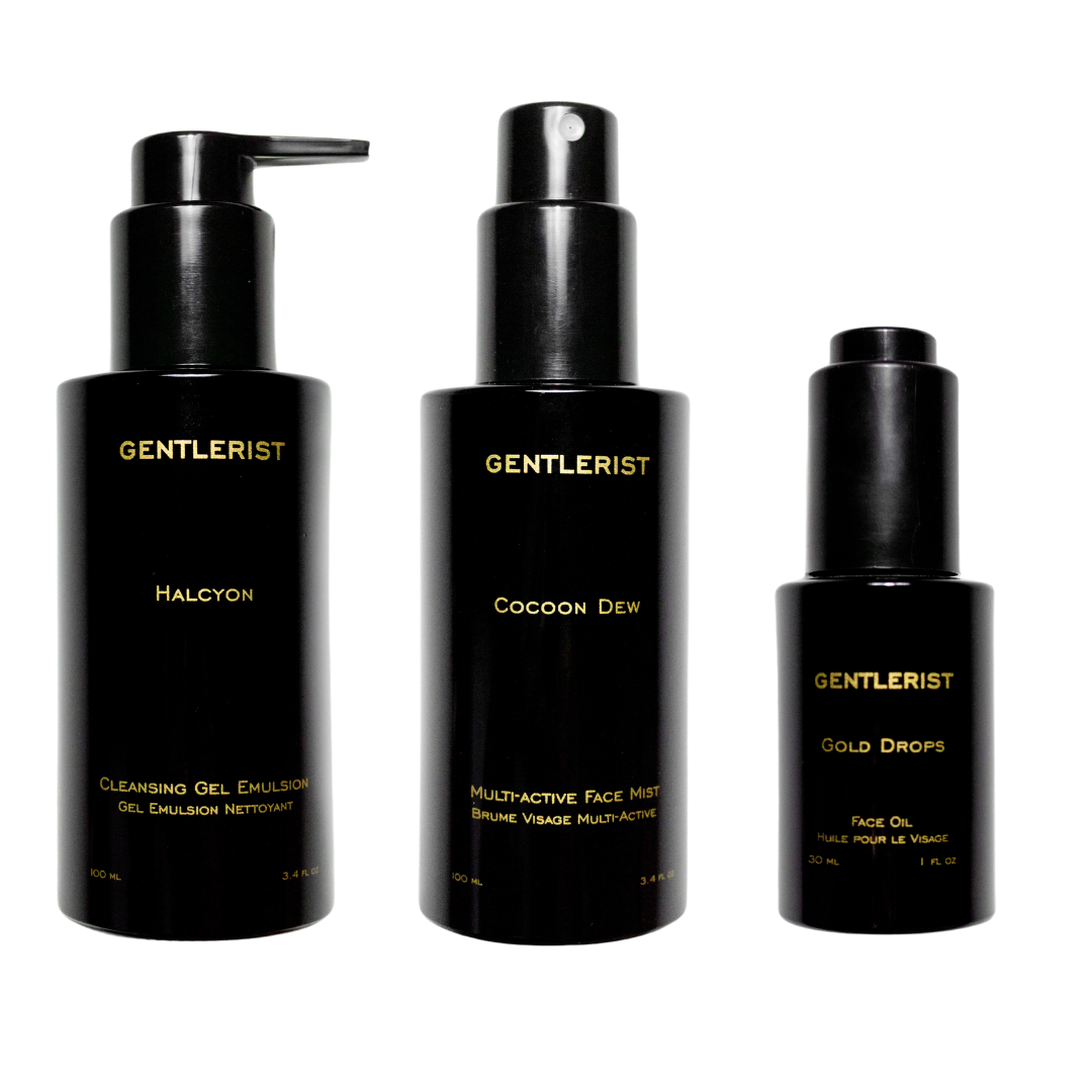 The Three-Step Ritual is designed to offer everything your skin needs in a simple yet powerful sequence. Halcyon cleanses thoroughly yet gently, Cocoon Dew hydrates and tones with soothing botanical care, and Gold Drops replenishes with the nourishing power of a multivitamin for your skin.
